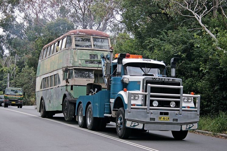 I thought these pictures of Scott Wilson’s White Road Boss tow truck, towing an ex-Sydney Government AEC Regent double decker, No. 2499, may be of interest to your readers. The photo was taken on Saturday, March 5th, 2011, on Myoora Road, Terrey Hills, NSW. The truck was purchased from Nowra Coaches.